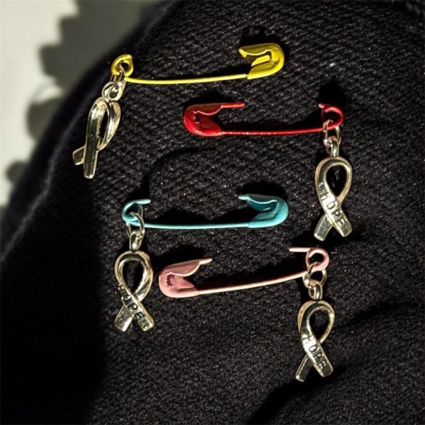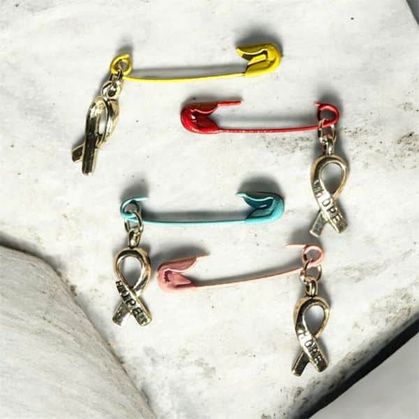 Färg: Nålar i HOPE färger Blå, Rosa, Röd och Gul. Ribbon/hänge i Antiksilver.