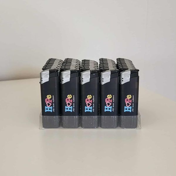Vår HOPE-tändare bär föreningens logga och symboliserar värme, hopp och gemenskap – samma värden som genomsyrar allt vi gör. Det är en Bic med elektronisk tändning och har måtten (B) 24 x (H) 9 x (L) 81 mm.